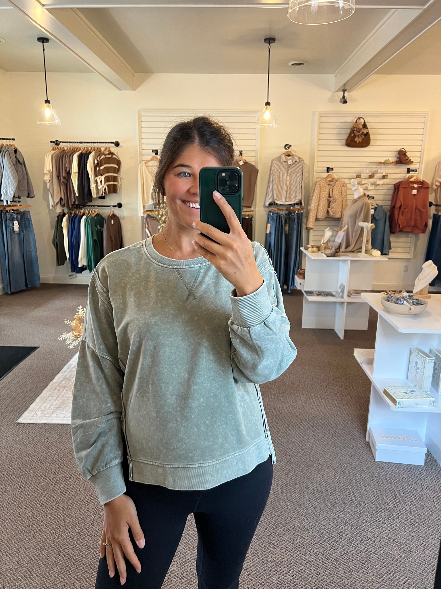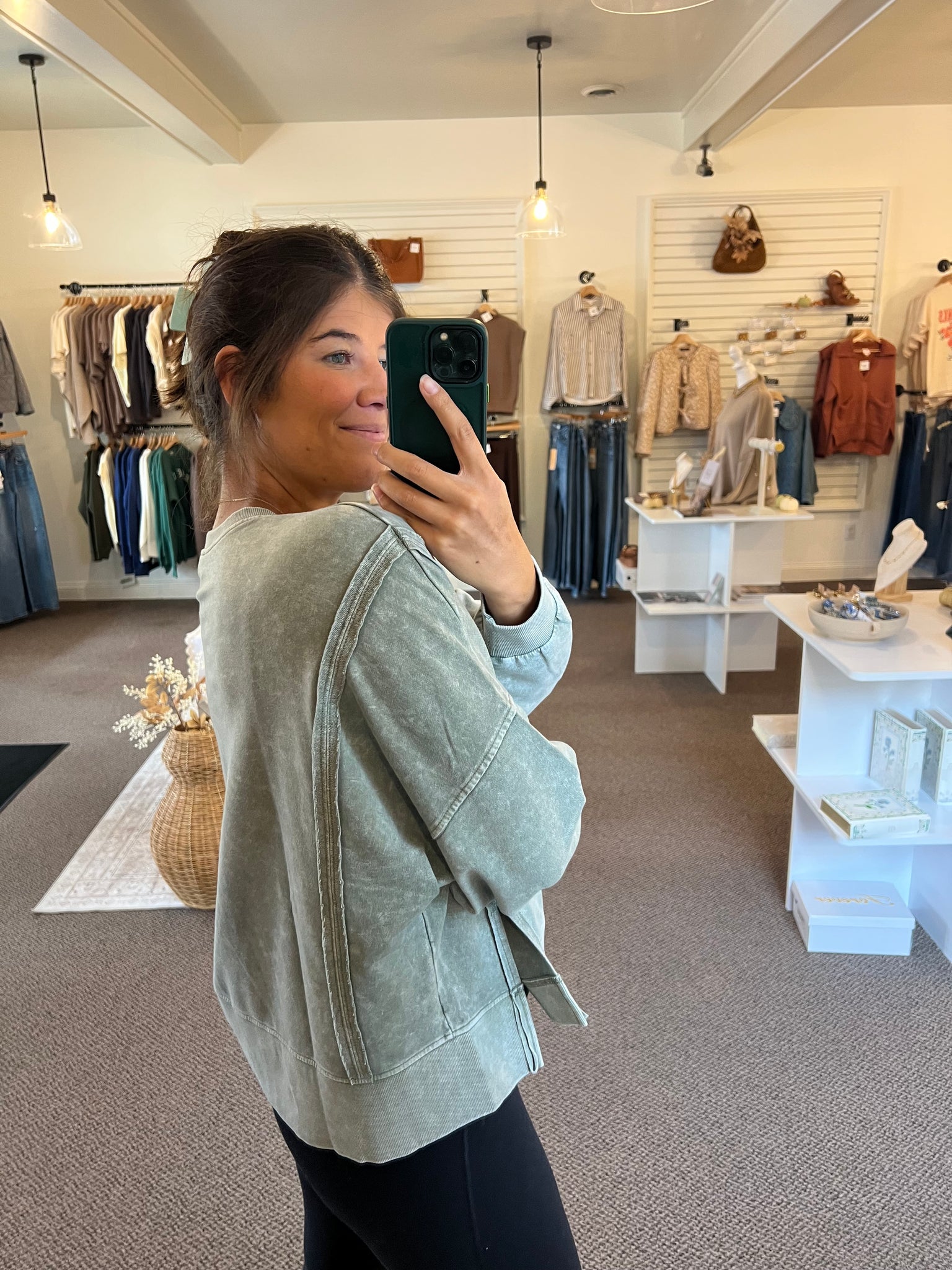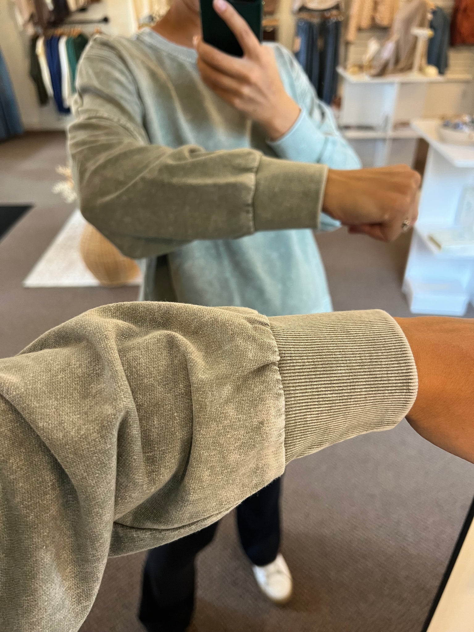 CREWNECK EXTENDED SHOULDER PATCHWORK DETAIL LONG SLEEVES ACID WASHED TONES MAY VARY KNIT TOP COLLAR UNDERSHIRT NOT INCLUDED