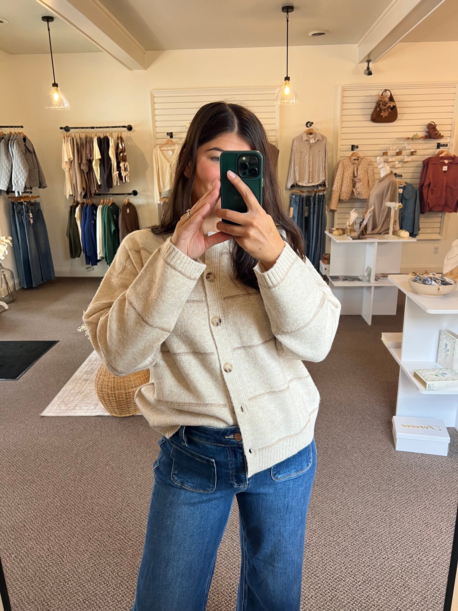 ROUND NECKLINE LONG SLEEVES DROP SHOULDER THIN STRIPE PATTERN RELAXED FIT KNIT CARDIGAN SWEATER WOOL BLEND 45%POLYESTER 33%RECYCLED POLYESTER 13%ACRYLIC 6%WOOL 3%SPANDEX