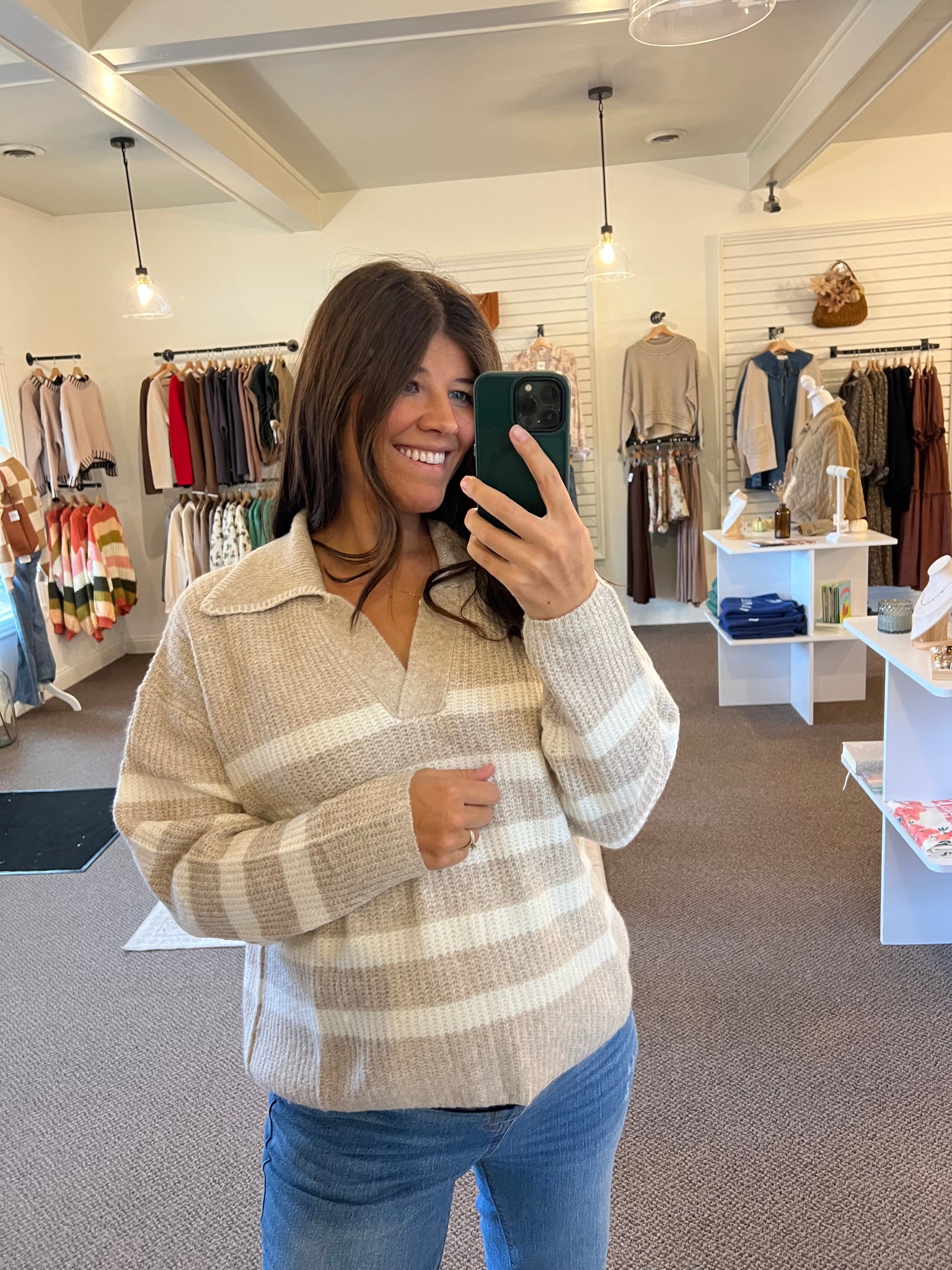 STRIPED SWEATER TOP WITH COLLAR STITCHED DETAILS80%POLYESTER 10%VISCOSE 8%WOOL 2%SPANDEX