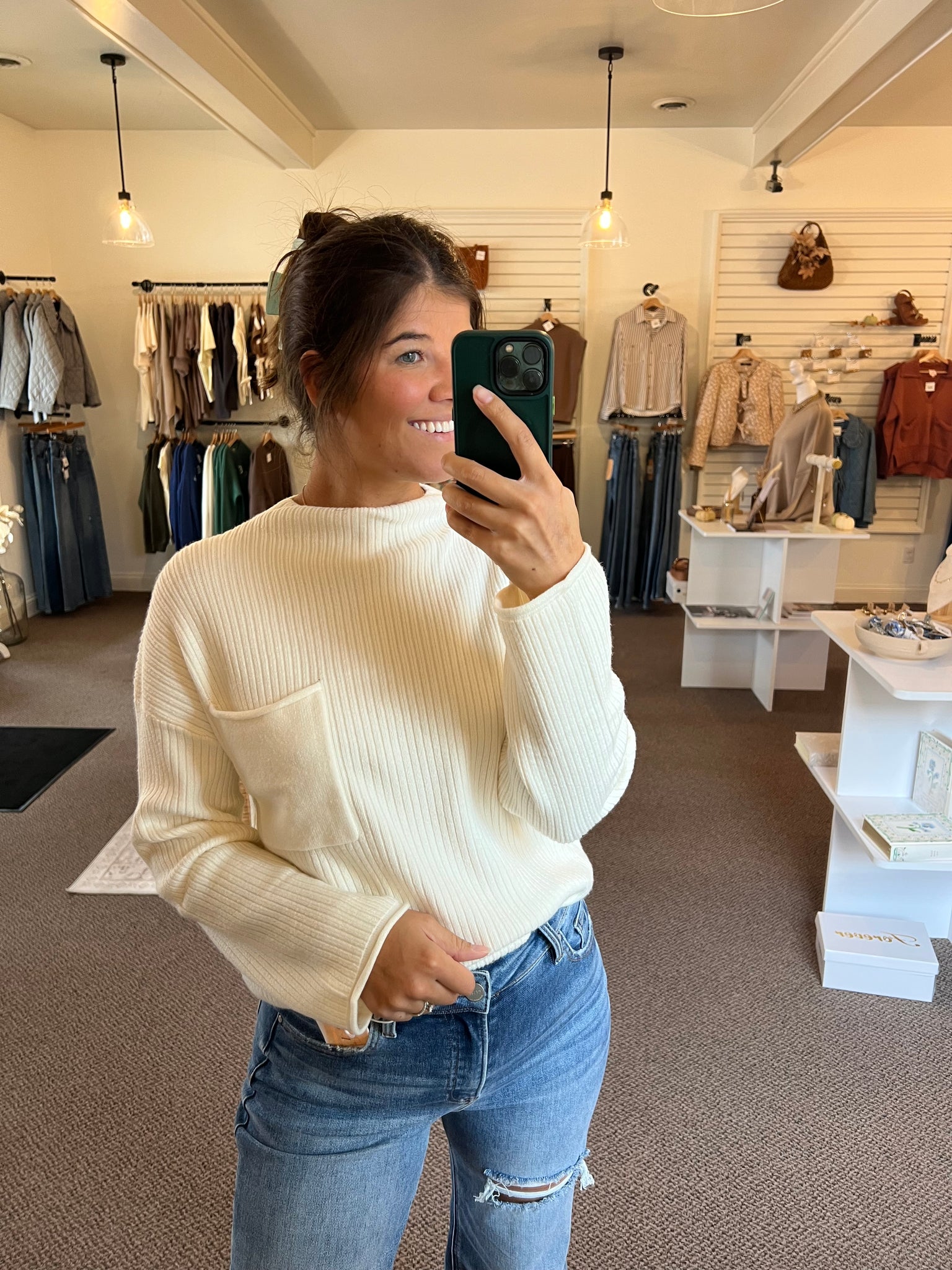 The softest sweater you will own!  Ribbed long sleeve lightweight sweater with a front pocket.  Hits right at your neckline with the softest feel.  52% rayon 28% polyester 20% nylon, chocolate color; wash in cold and lay flat to dry.