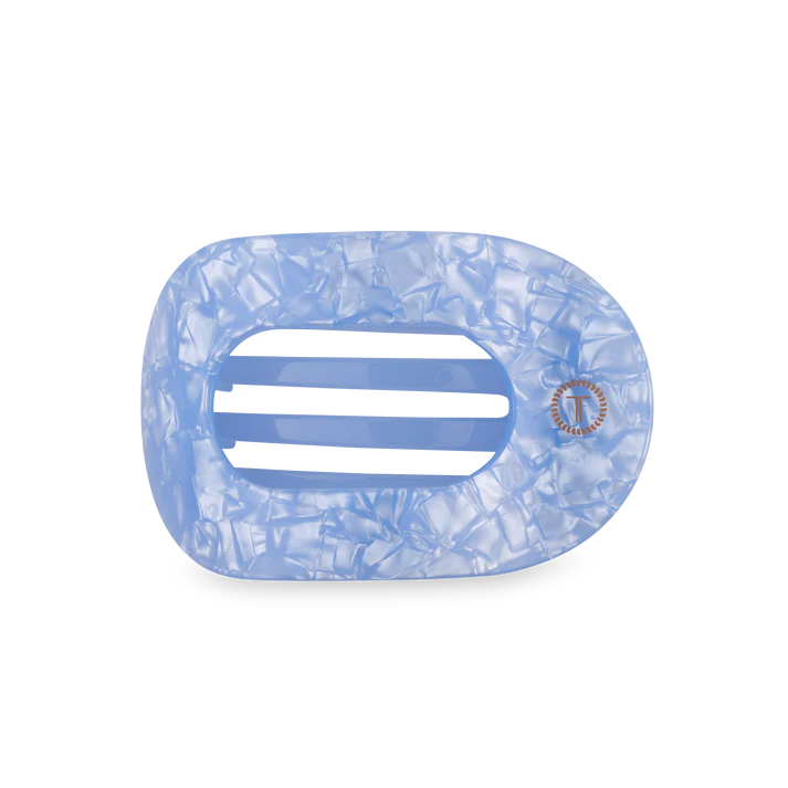 Lay flat and relax with the new TELETIES Blue Lagoon Medium Flat Round Hair Clip in Blue. This hair clip is designed to allow you to lay back flat, do yoga, or sit comfortably in a seat with a headrest, and it is made with the same material that is nearly unbreakable.