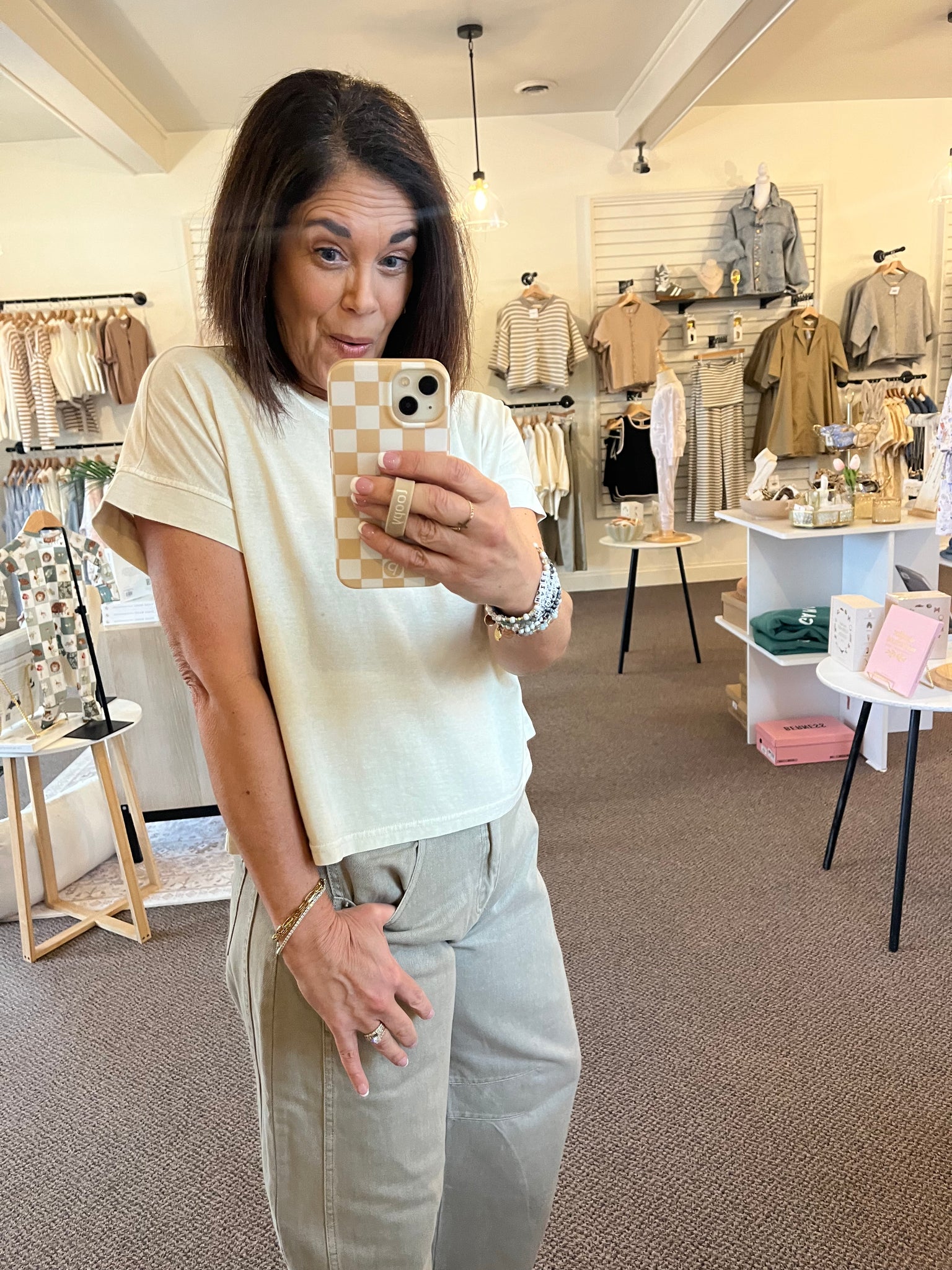 ROUND NECKLINE SHORT SLEEVE BOXY FIT SLIGHTLY CROPPED KNIT TOP WASHED PATTERN TONES MAY VARY 100%COTTON; lightweight and cozy!