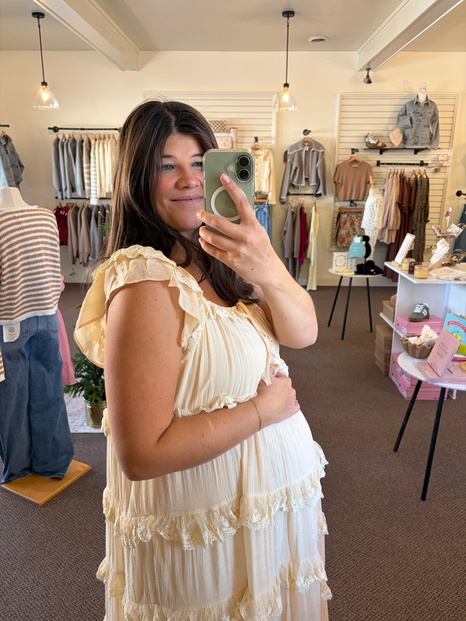 + Tiered lace trim flowy maxi dress + Scoop elastic neckline with tying detail + Lace trim flutter sleeves + Tiered lace trim + Lined
