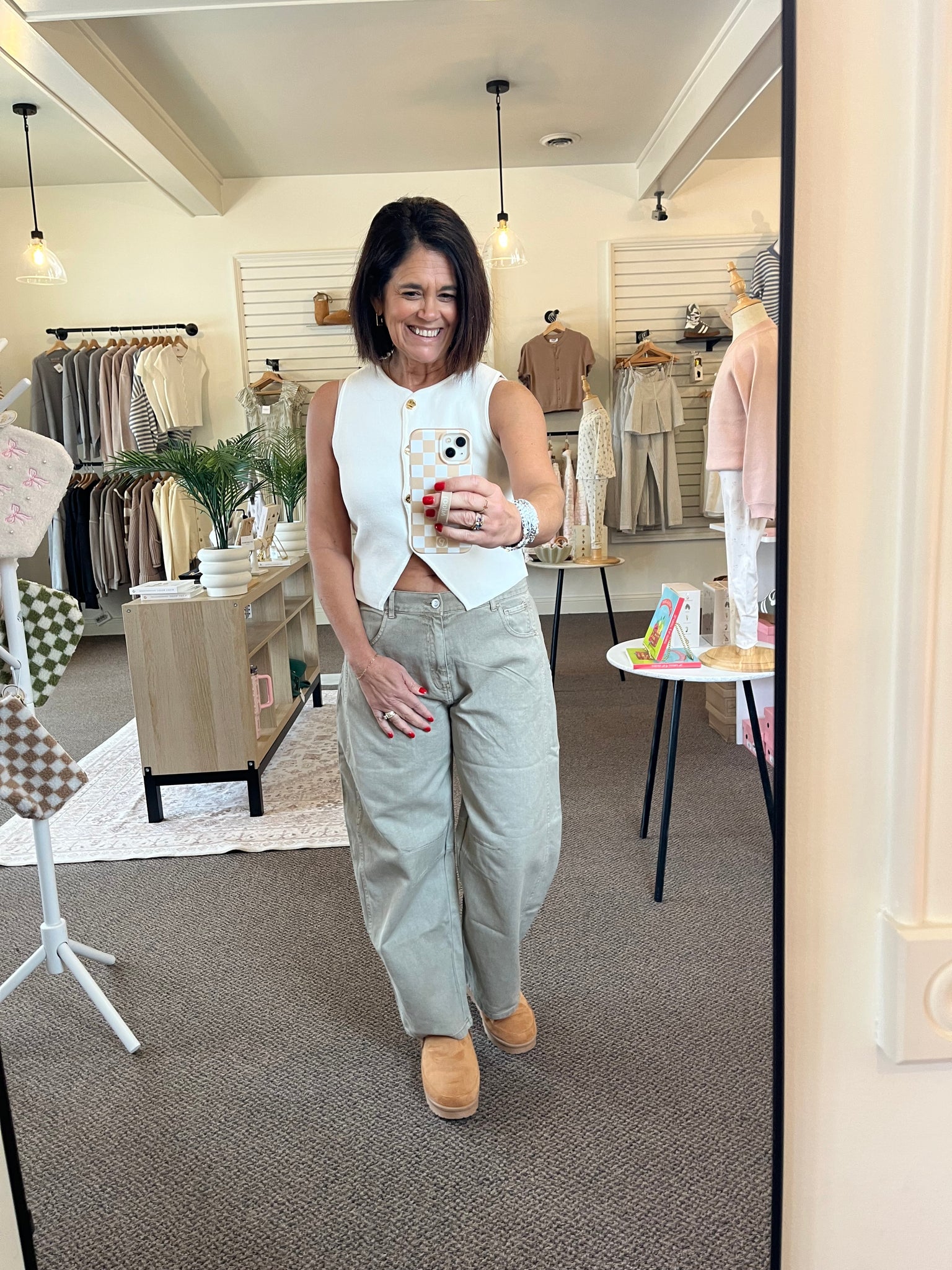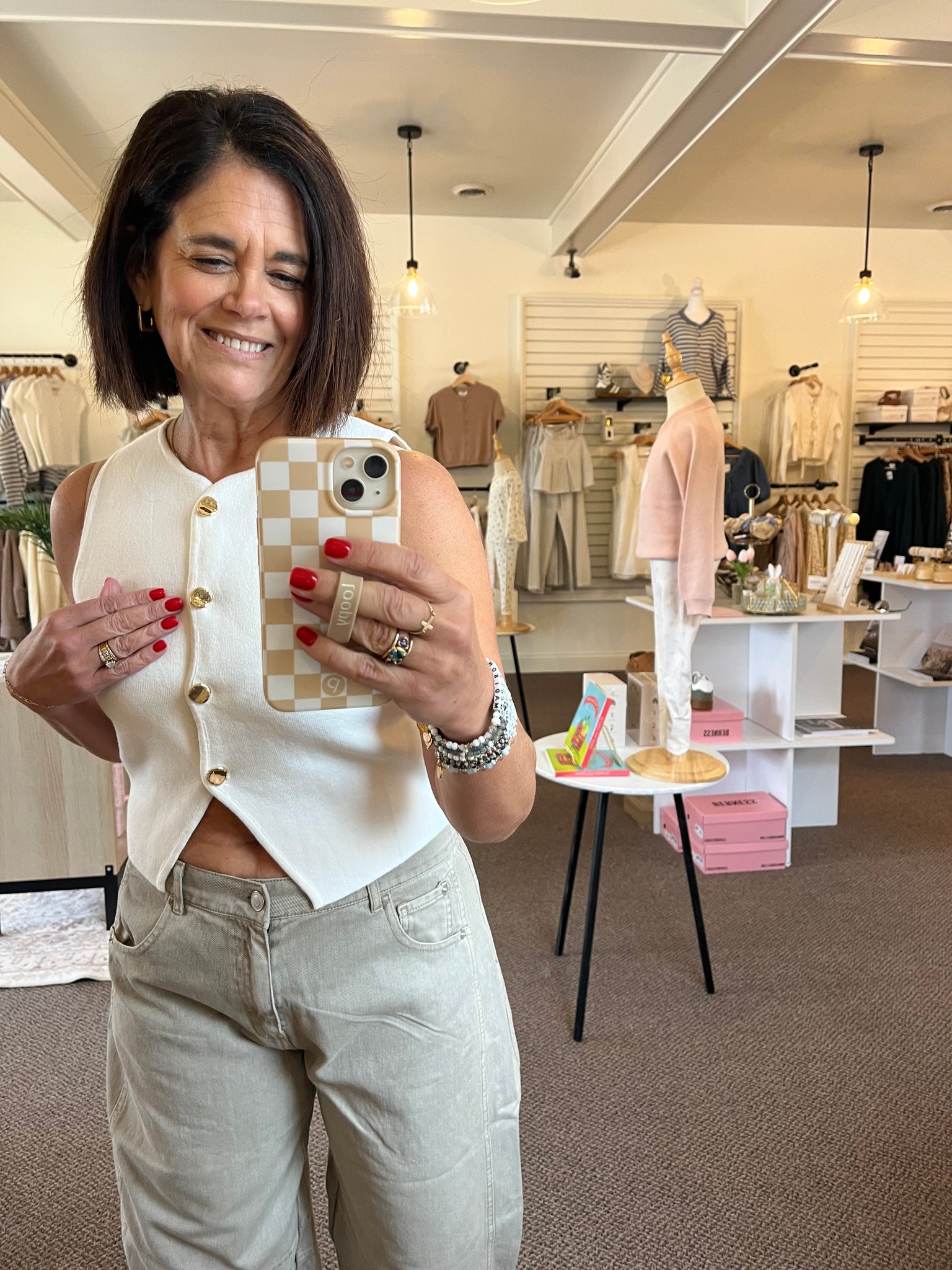 THIS COZY VEST HAS A ROUND NECKLINE SLEEVELESS FRONT GOLD BUTTON DOWN DETAIL FRONT BOTTOM SLIT CROPPED 70%COTTON 30%NYLON