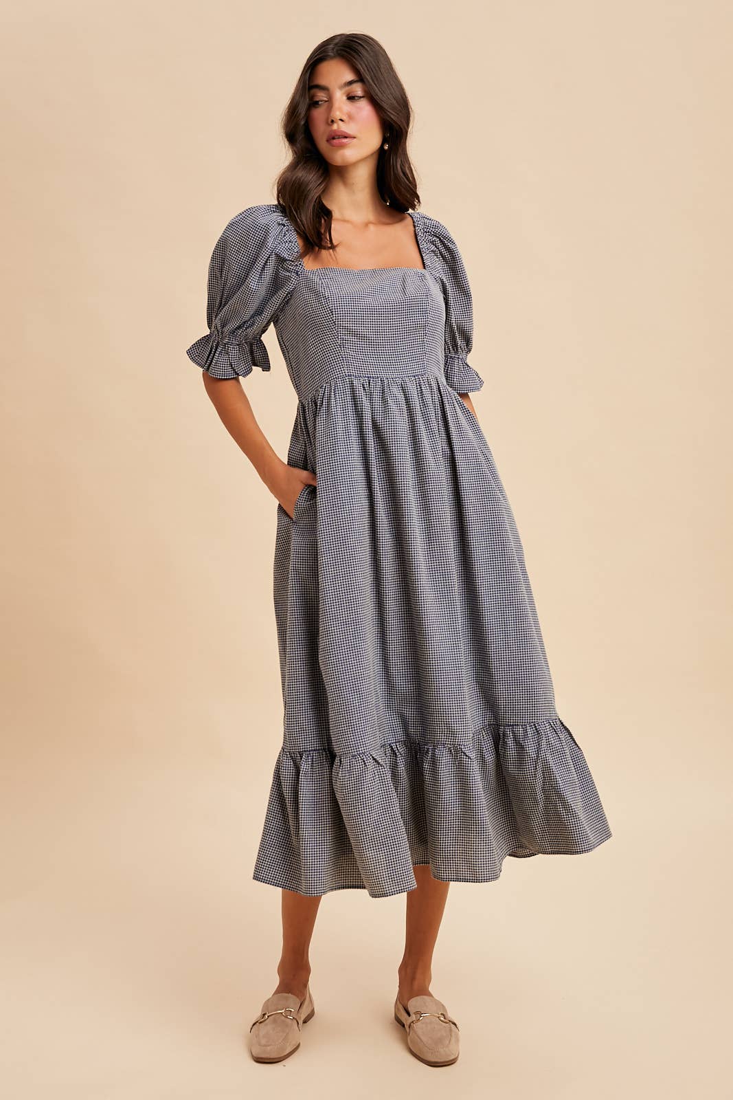 This lovely navy square neck midi dress features a cotton blend grid checkered fabrication; square neckline; 3/4 sleeves with ruffled ends; princess bust; partially smocked back; side pockets; flounced hem; and full lining! Fits true to size and ready for your next outing.