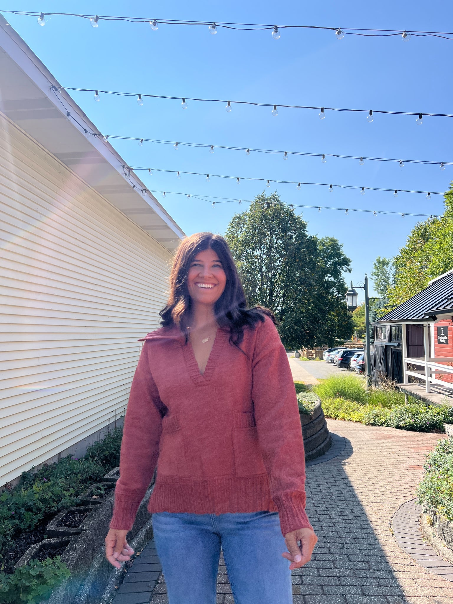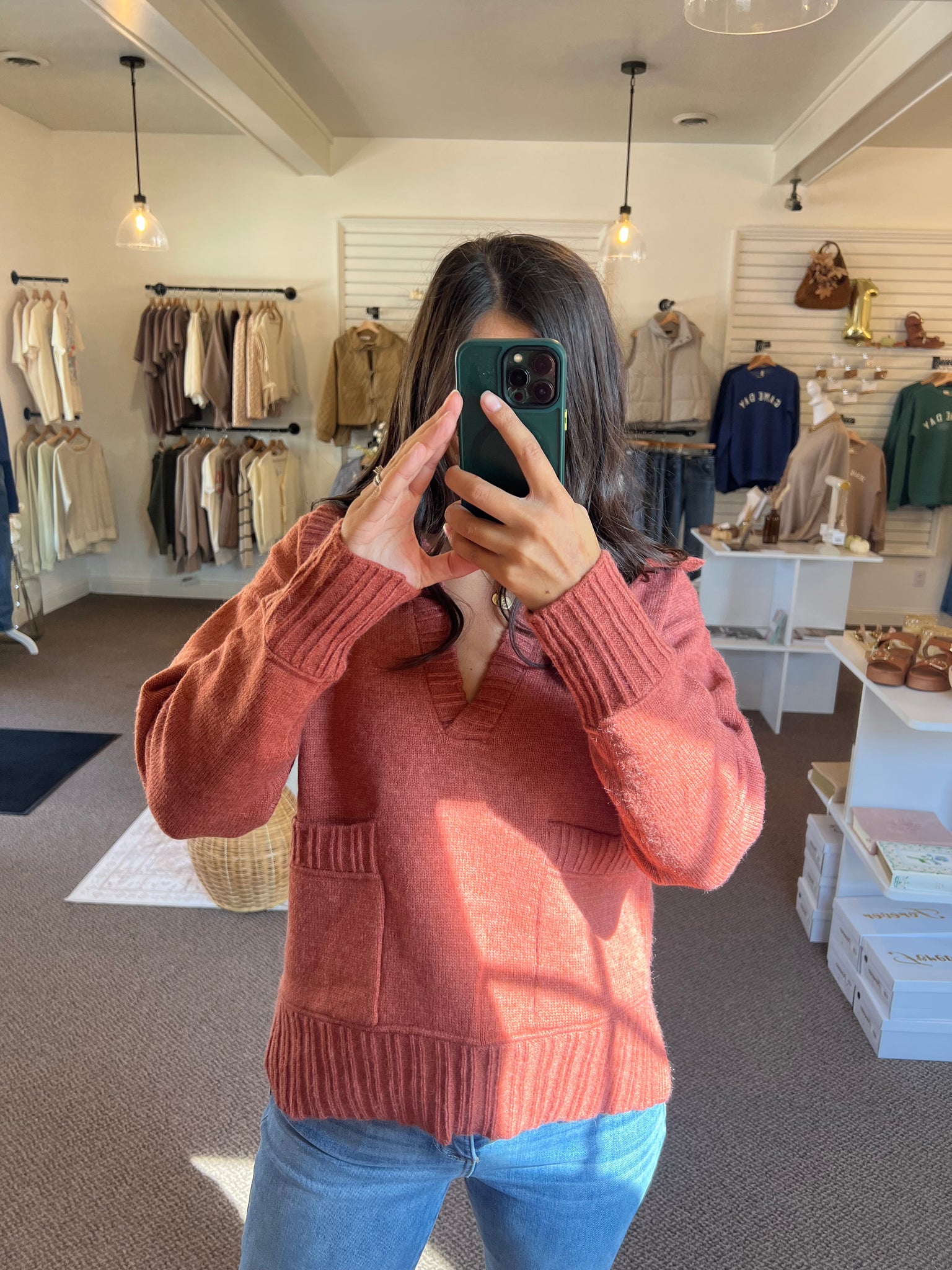 FLAP COLLAR KNIT CROP PULLOVER WITH POUCH POCKETS