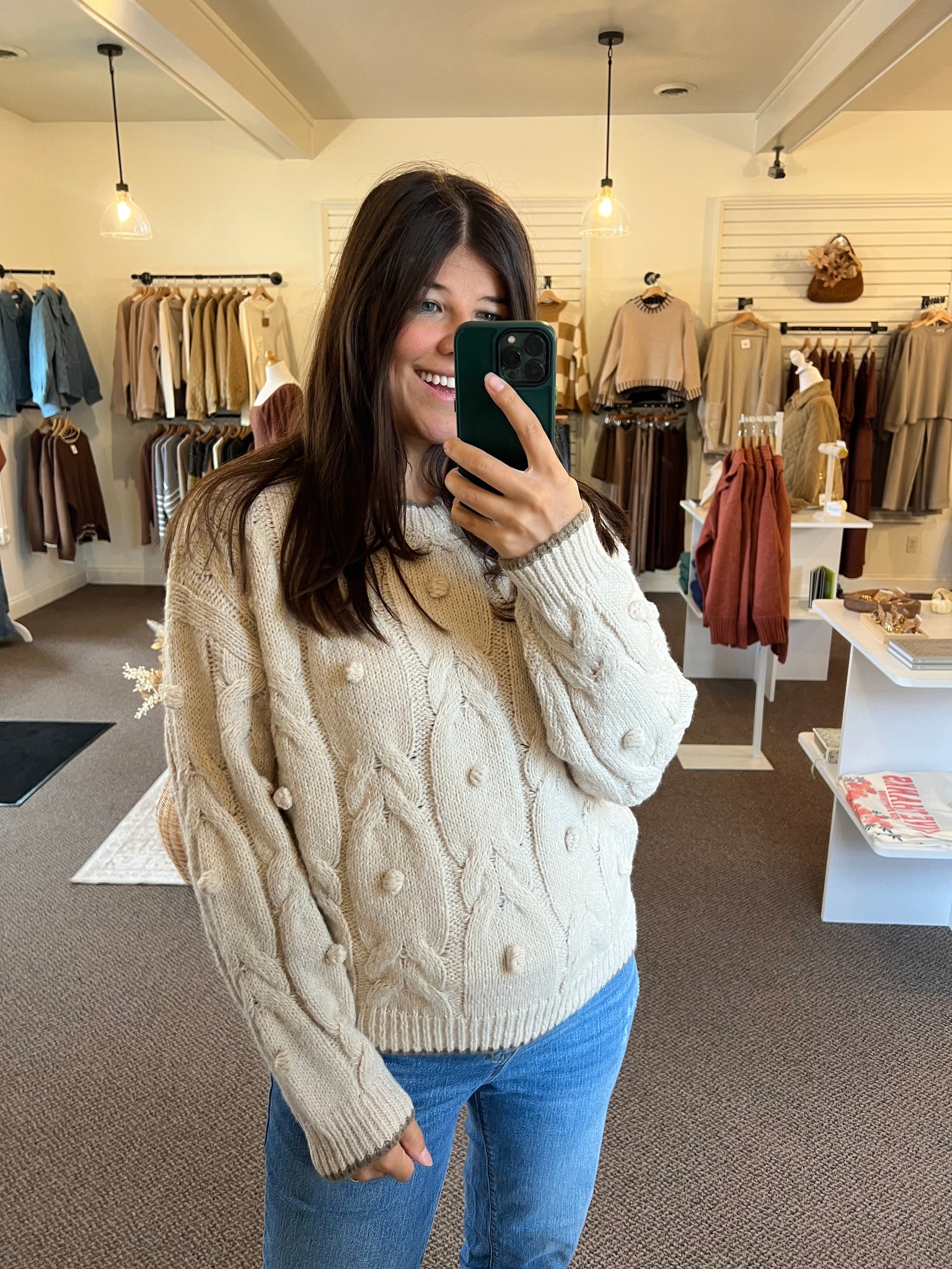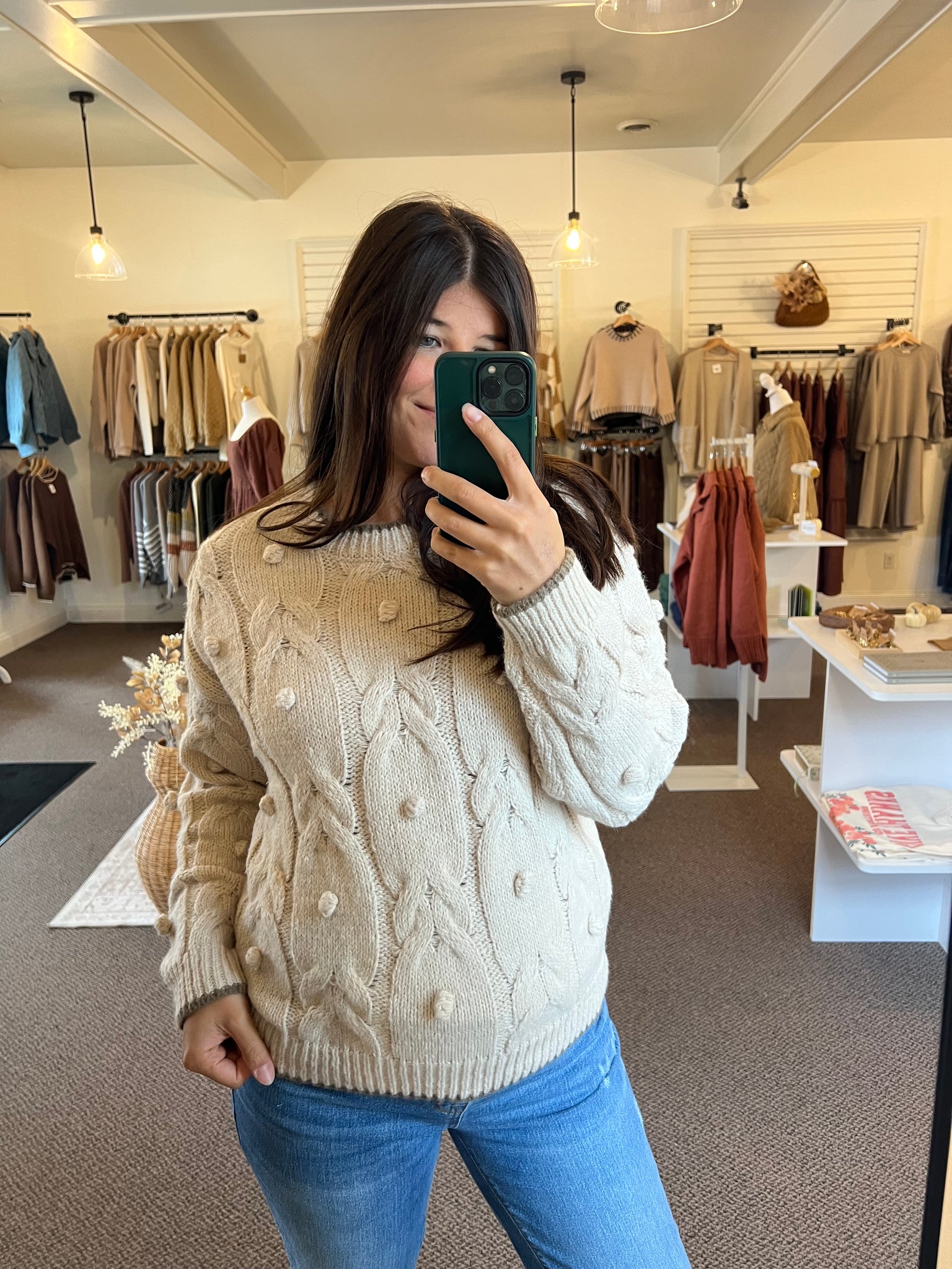 LARGE ROUND NECKLINE LONG SLEEVES DROP SHOULDER CABLE KNIT PATTERN CONTRAST TRIM DETAIL KNIT PULLOVER SWEATER 76%POLYESTER 19%ACRYLIC 5%NYLON